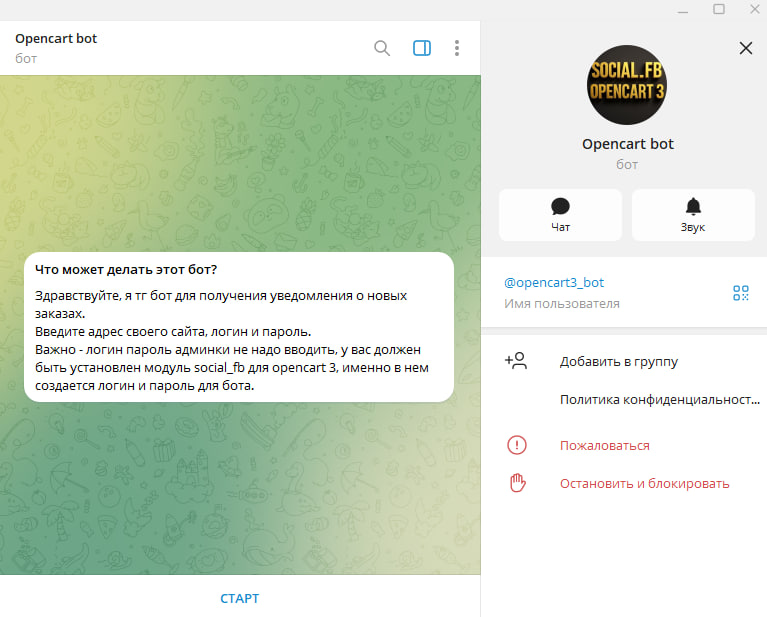 4 откройте в тг бота @opencart3_bot и следуйте его инструкциям, введите адрес сайта \ логин пароль созданный в админке ( не от самой админки, а тот что вы создали в модуле ).