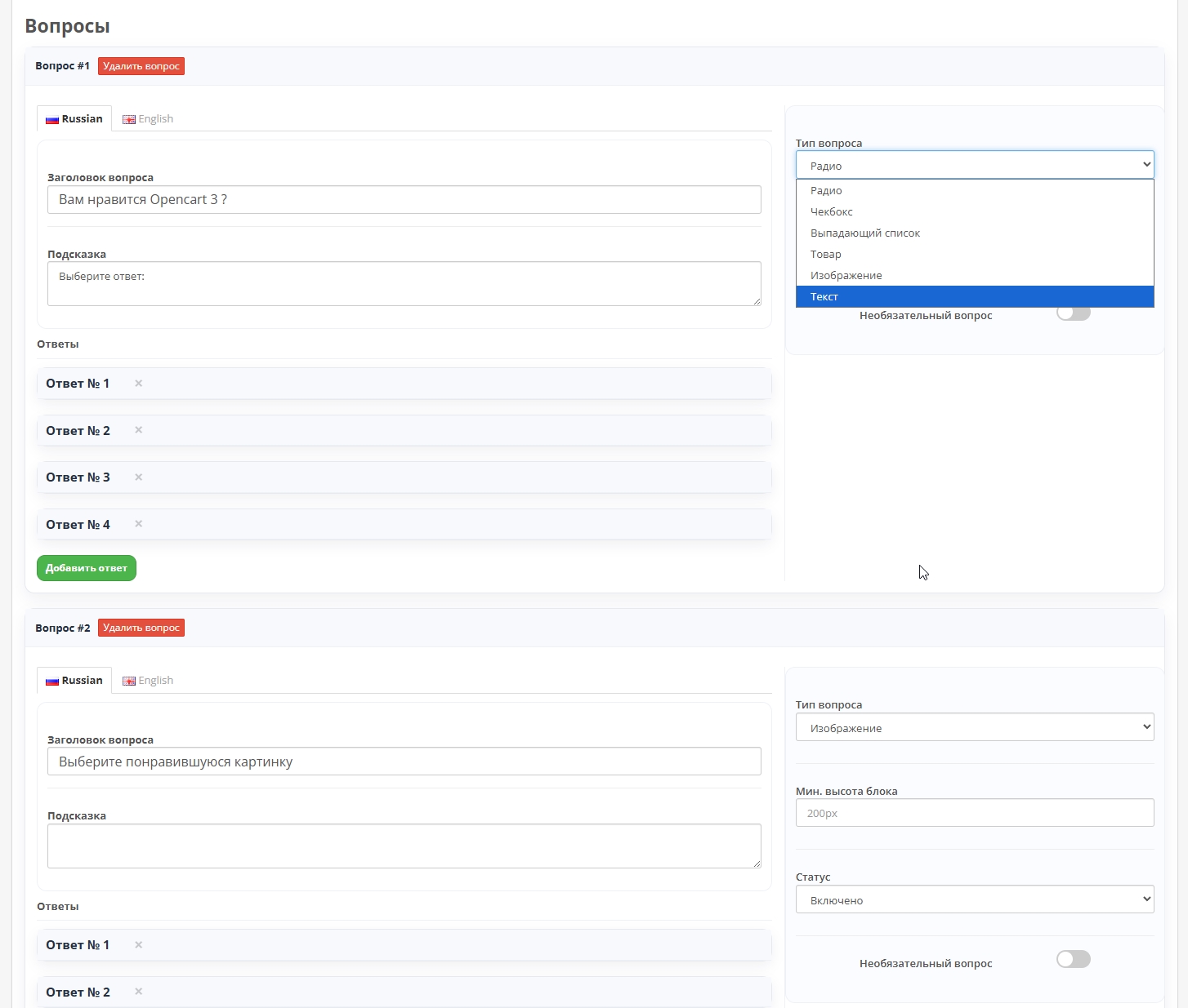 - Использовать различные типы вопросов: одиночный выбор (радио-кнопки), множественный выбор (чекбоксы), выбор изображений, выпадающие списки, текстовые поля и даже привязка к конкретным товарам.