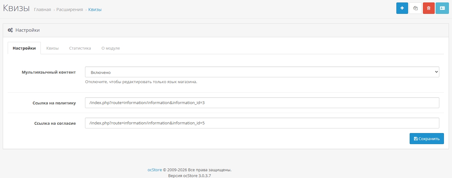 - Перейдите в раздел «Расширения» → «Модули», найдите «Квизы» и настройте.