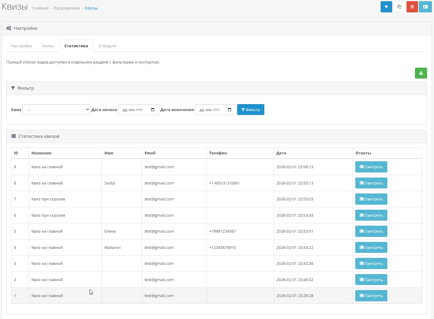 - Получать подробные отчеты и статистику по каждому квизу: просмотры, конверсия, ответы пользователей и собранные лиды (контакты). Вся информация доступна в удобной таблице с фильтрами.