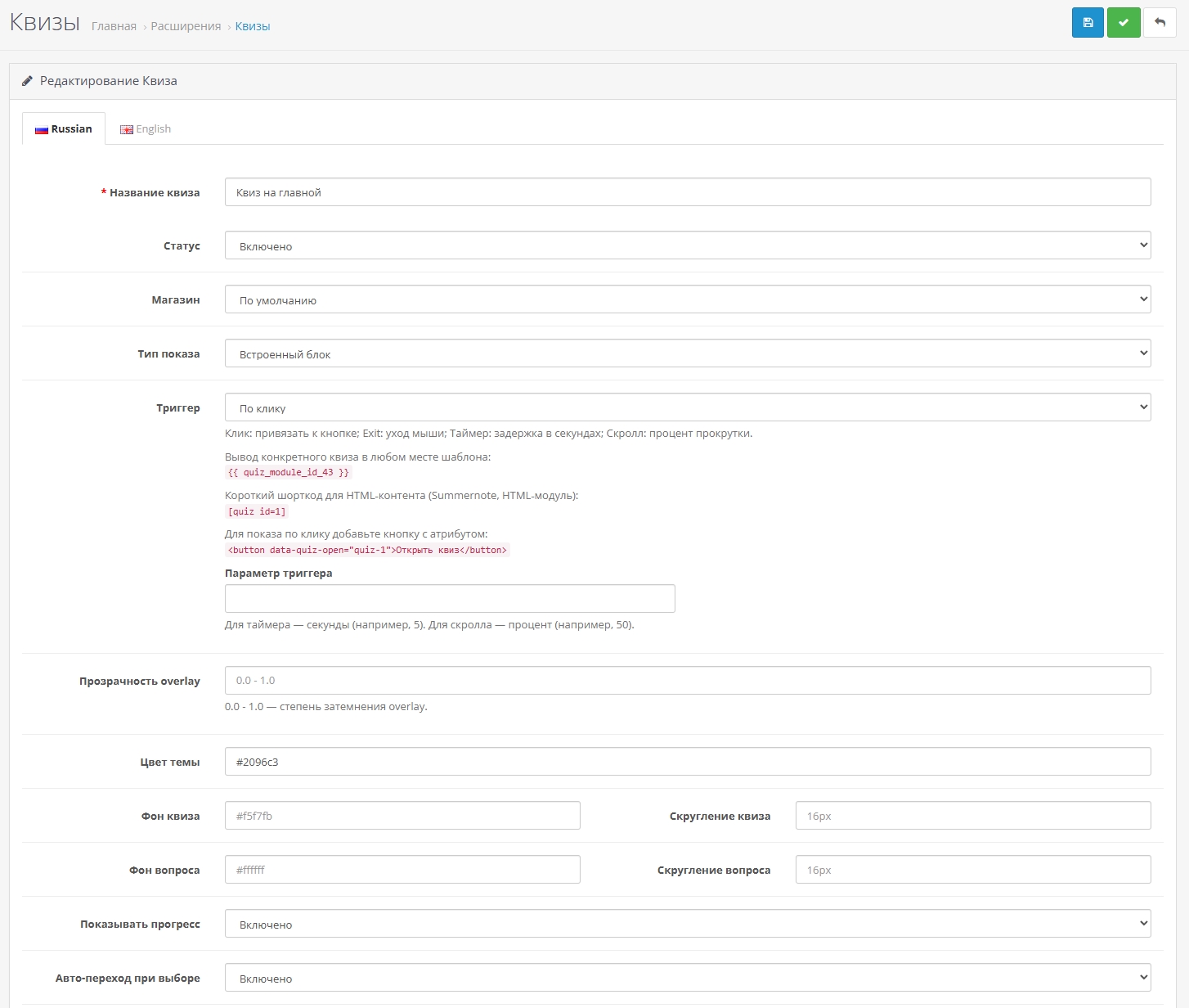 - Встраивать квиз несколькими способами: как готовый блок через модификатор, в любое место шаблона через переменную {{ quiz_module_id_X }} или в HTML-контент с помощью короткого кода [quiz id=1].