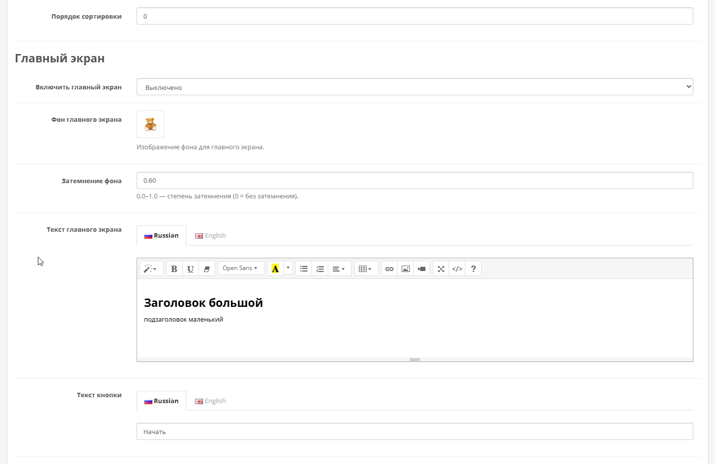 - Создавать эффектный главный экран (заставку) для квиза с фоновым изображением, заголовком и кнопкой призыва к действию.