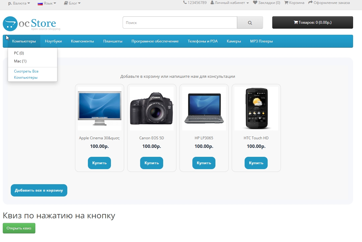 - Полностью интегрироваться с OpenCart. В финале квиза автоматически показывает подобранные товары с ценами, изображениями и кнопками «Купить» или «Добавить все в корзину».