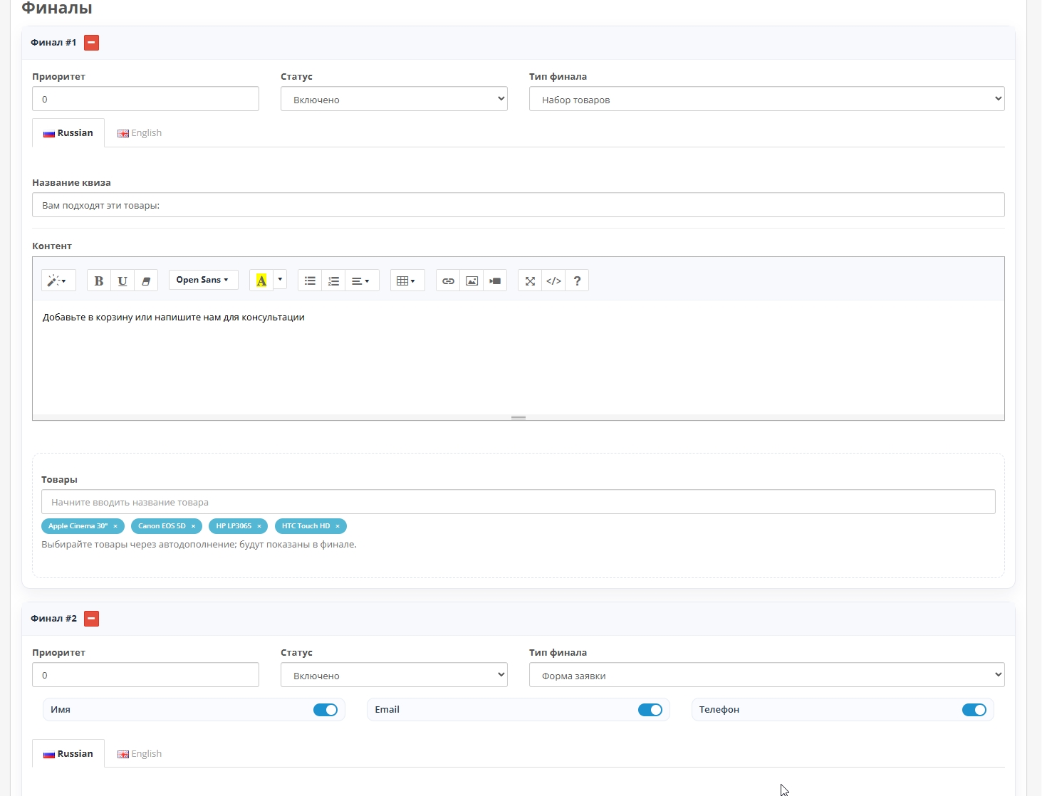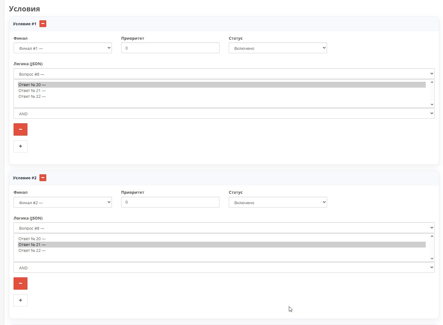 - Гибко настраивать логику показа финалов с помощью системы условий (JSON). В зависимости от ответов пользователя можно показывать разные наборы товаров или формы заявки.