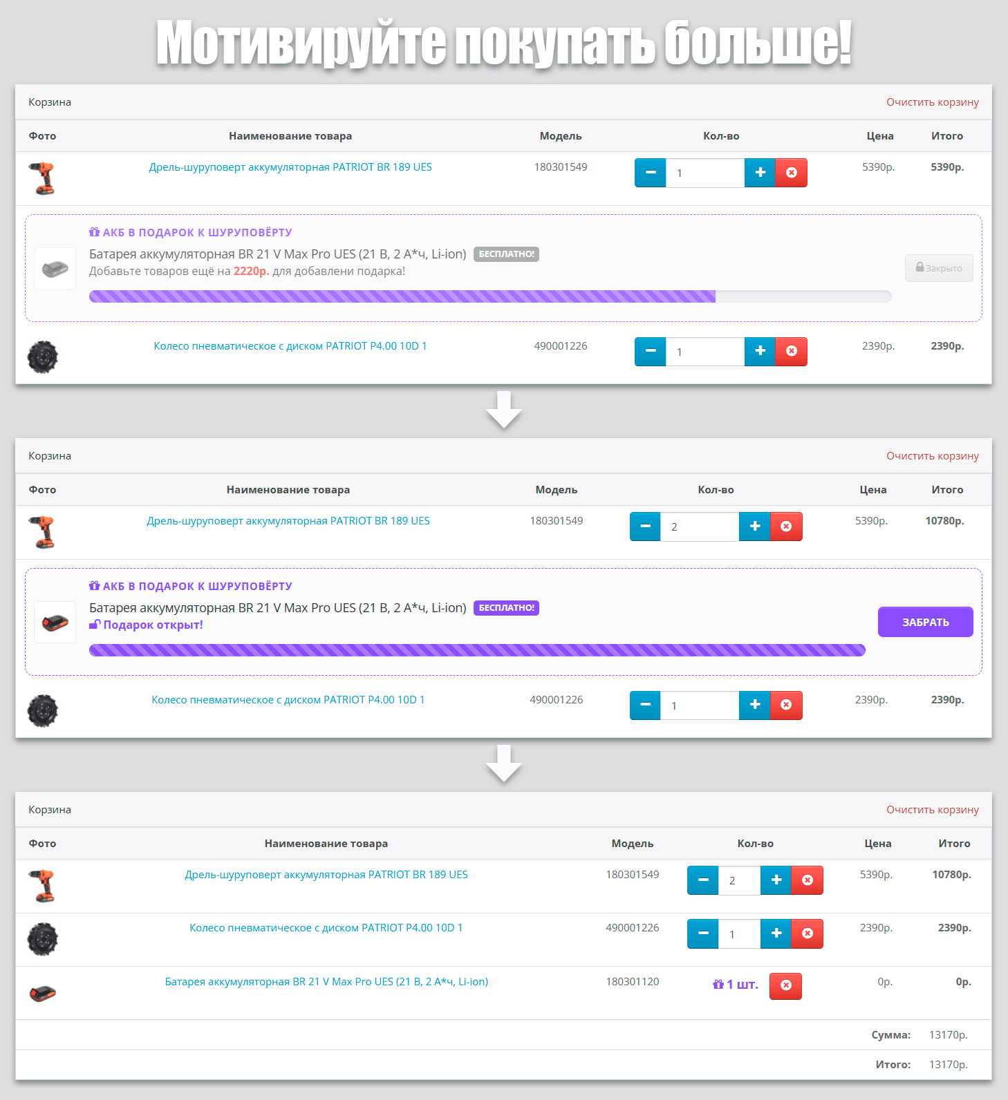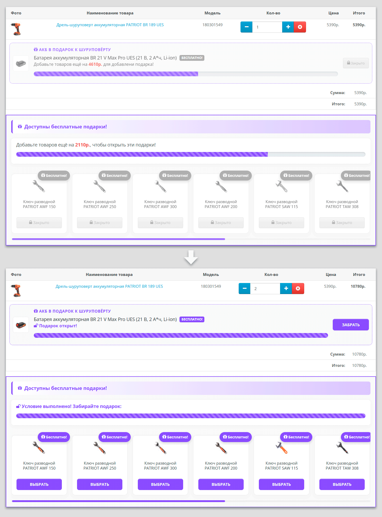 Мотивационный Прогресс-бар: Интерактивная шкала в корзине показывает, сколько именно осталось потратить до получения подарка. Анимированные полоски и динамический расчет создают психологический эффект «надо добить до цели».