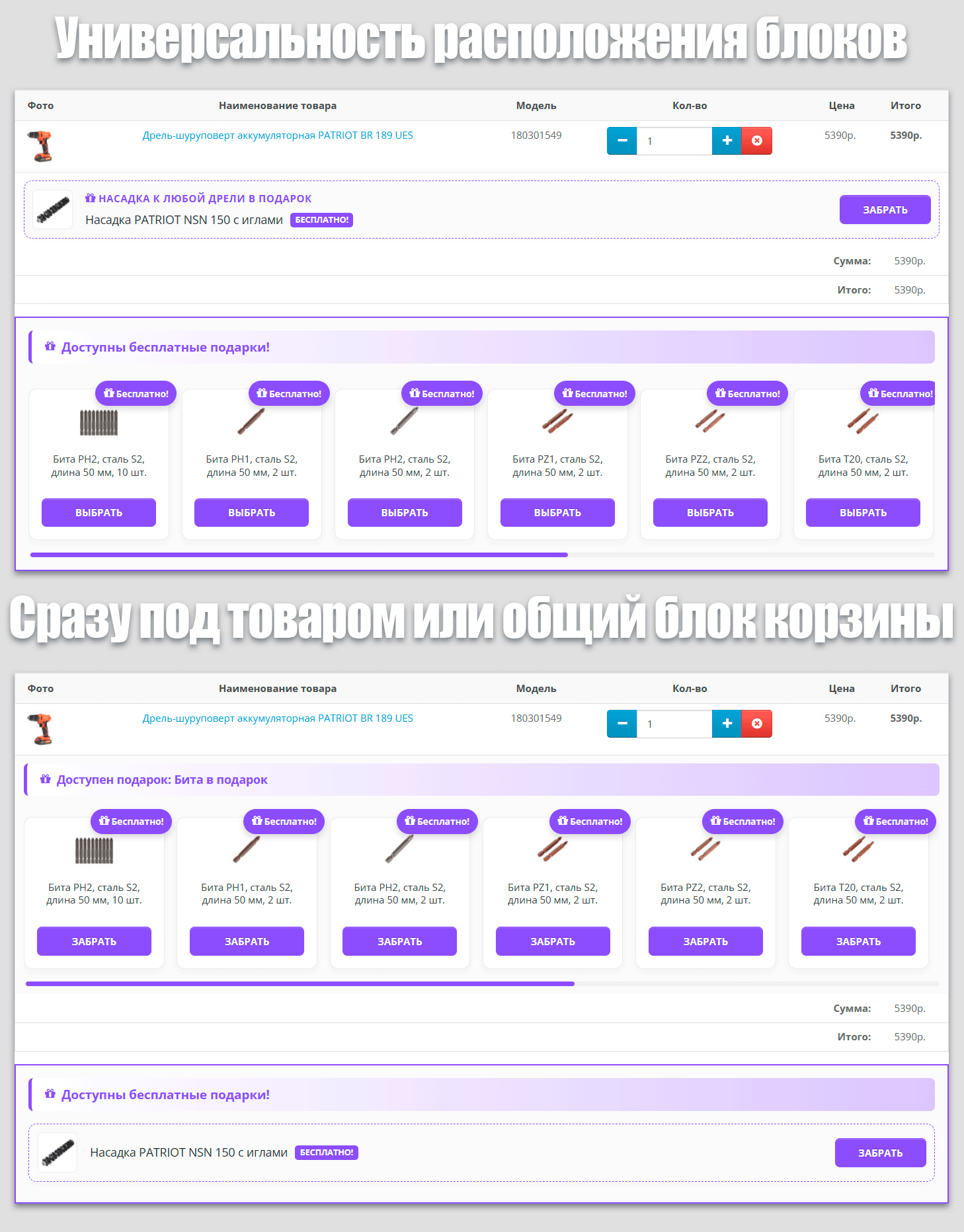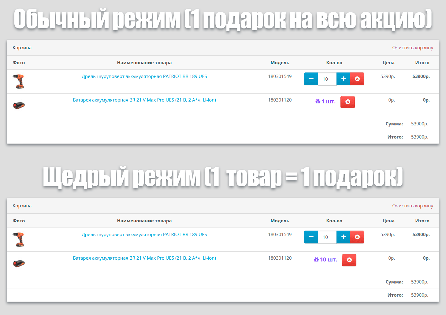 «Щедрый режим» (Multi-qty): Покупают 3 телевизора? Дарите 3 кронштейна! Модуль умеет привязывать количество подарков к количеству товаров в корзине в один клик.