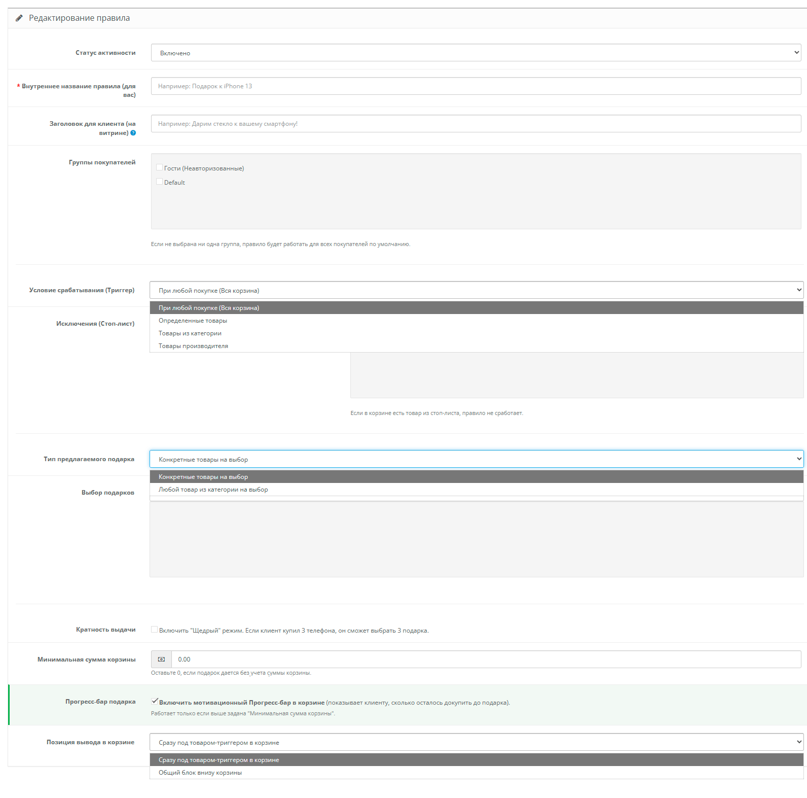 Продвинутый Стоп-лист (Исключения): Полный контроль над маржой. Запретите выдачу подарков, если в корзине есть товары из категории «Распродажа» или специфические акционные артикулы.