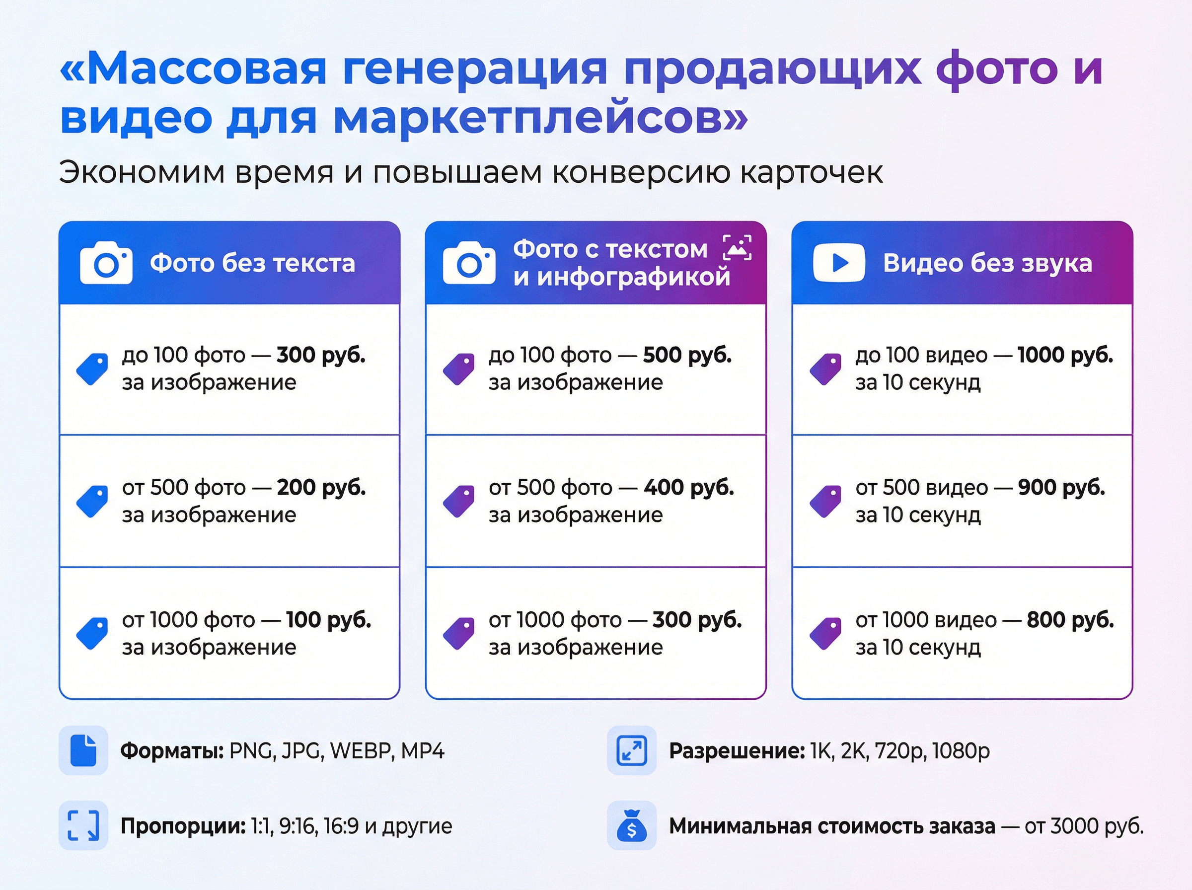 Массовая генерация продающих фото/видео для Ozon и Wildberries, которая реально экономит время и поднимает конверсию карточек.
