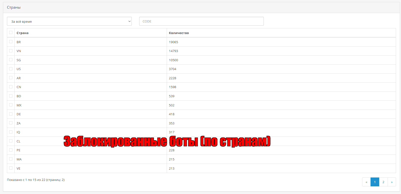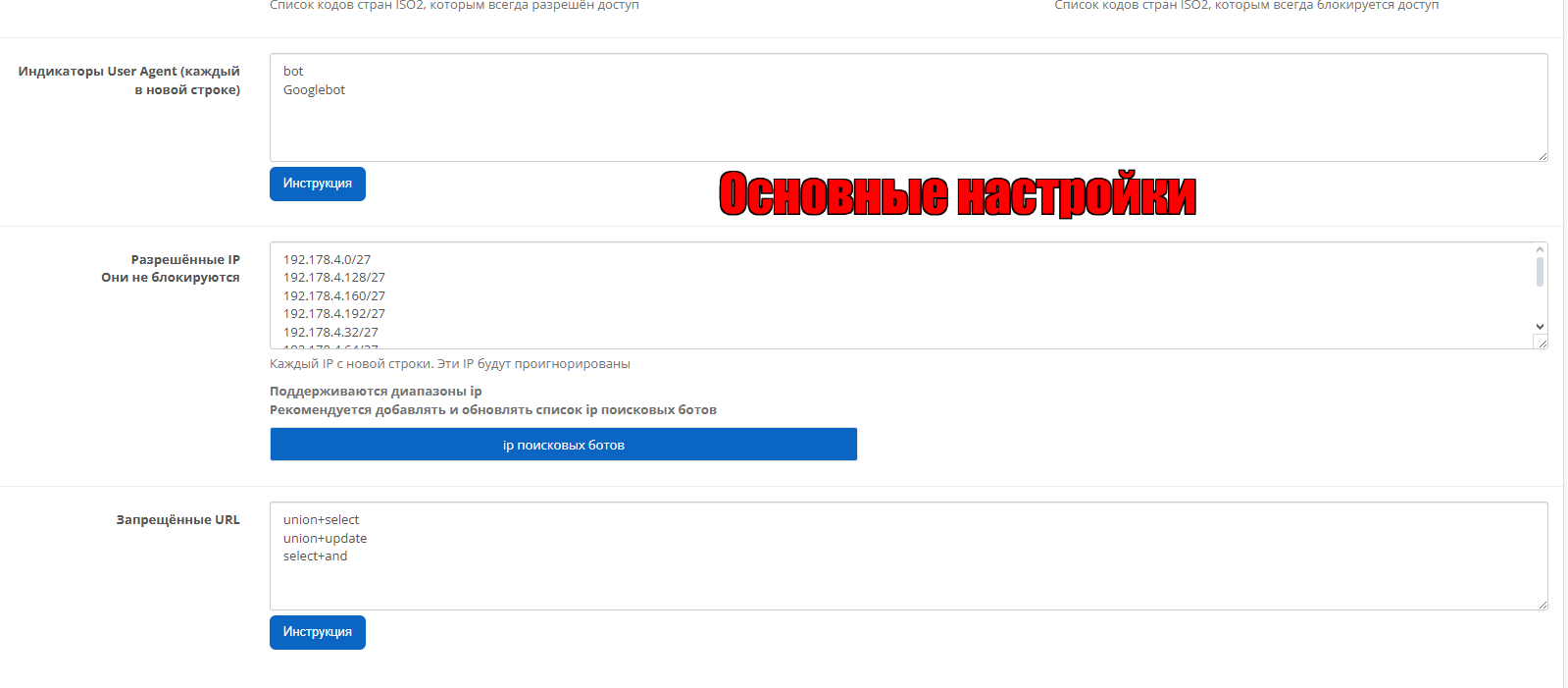 Чтобы заблокировать ботов нужно выбрать страны которые вам не нужны и модуль заблокирует их.
