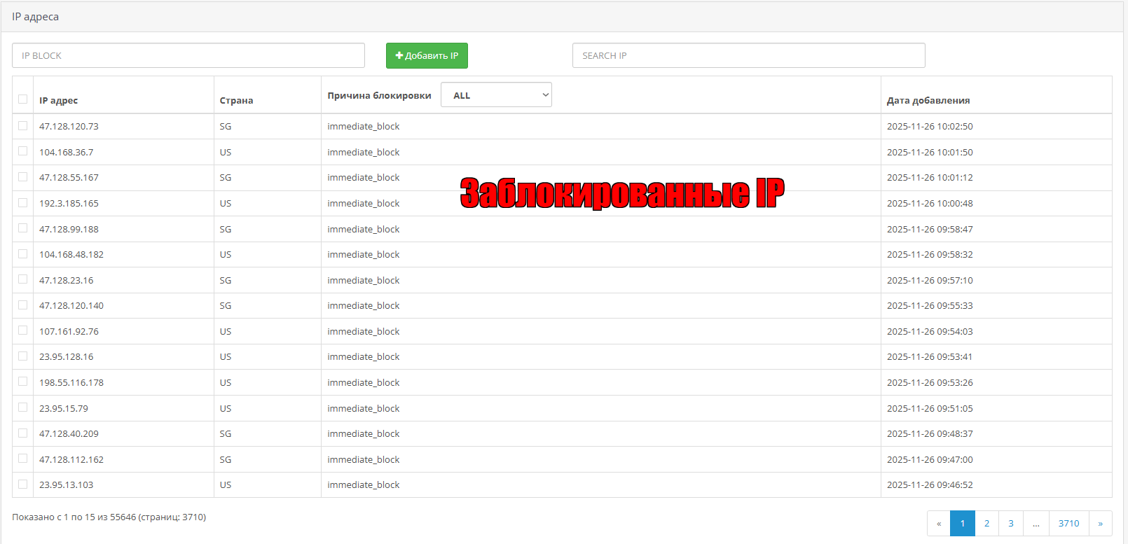 4 Ручная блокировка - В разделе заблокированные можно добавить Ip адреса которые хотите заблокировать, там же их можно разблокировать