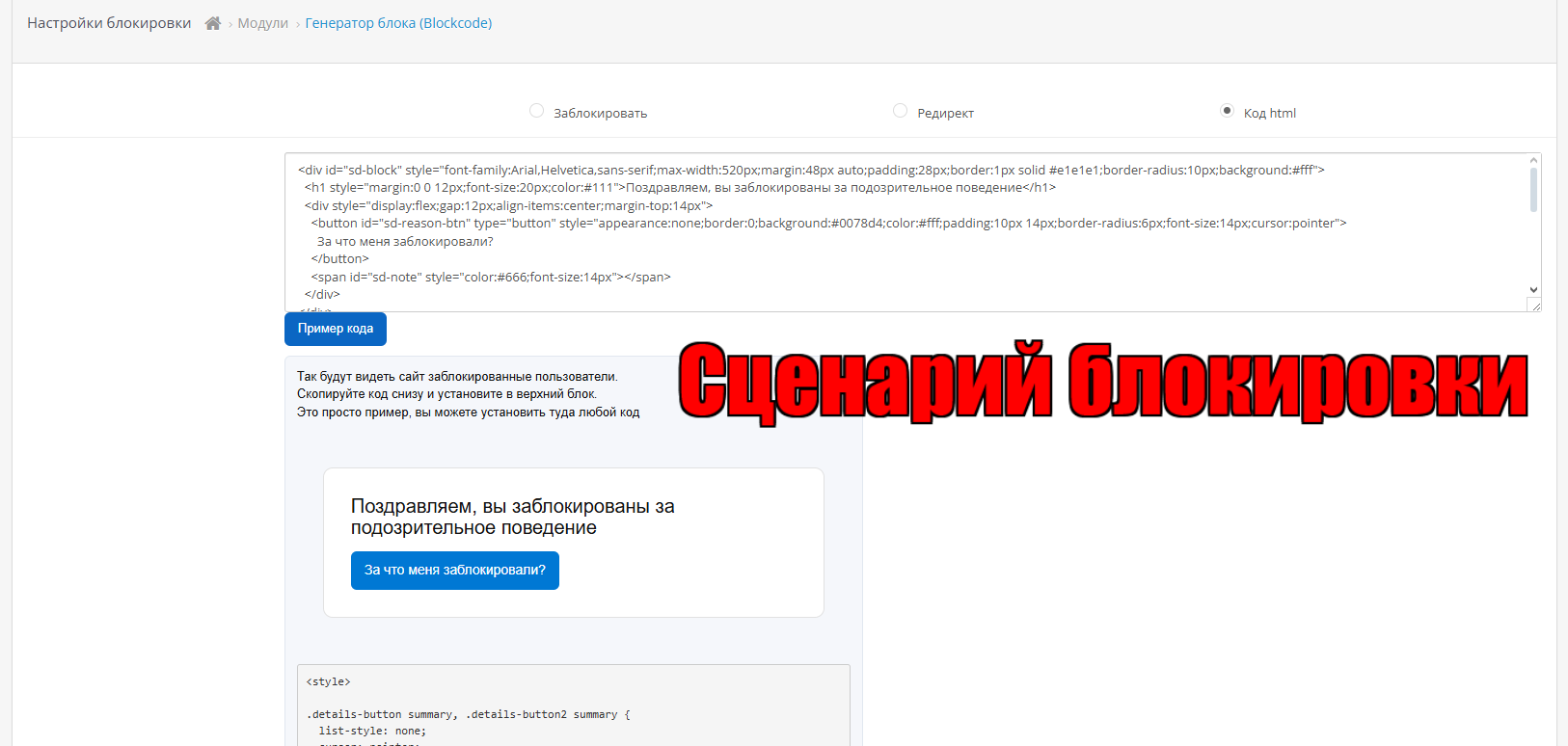 8 Зайдите в раздел настройки блокировки и выберите что делать с заблокированными пользователями, просто блокировать (по умолчанию), редирект (не рекомендуется слать их на чужие сайты, там увидят откуда они перешли), или код HTML ( можно установить красивую форму с контактами).