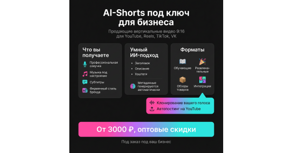 AI‑Shorts под ключ для бизнеса — это создание коротких вертикальных видео в формате 9:16 на основе фото карточек товаров, данных из прайс‑листов или текстовых описаний.