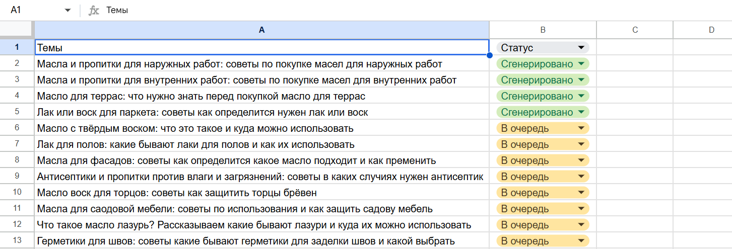 - Берёт темы статей из Google Sheets со статусом «В очередь»;