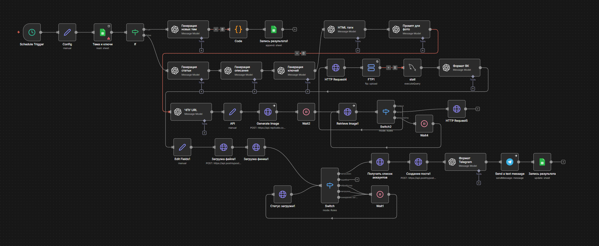 Это готовый сценарий для платформы n8n, который автоматизирует полный цикл работы с контентом: от идеи до публикации.